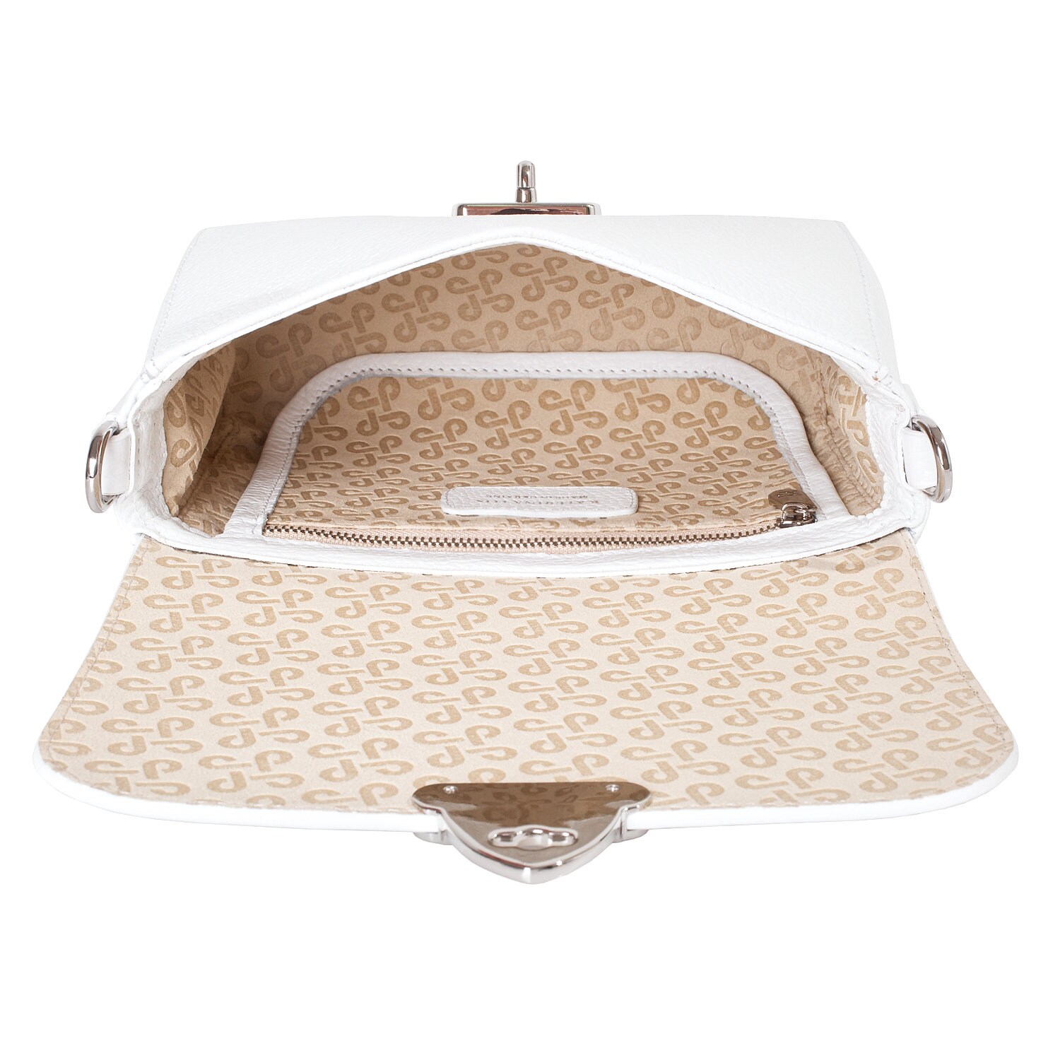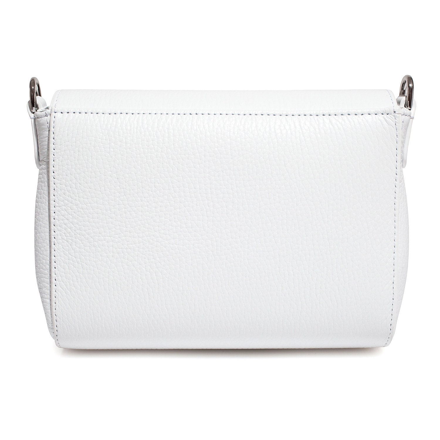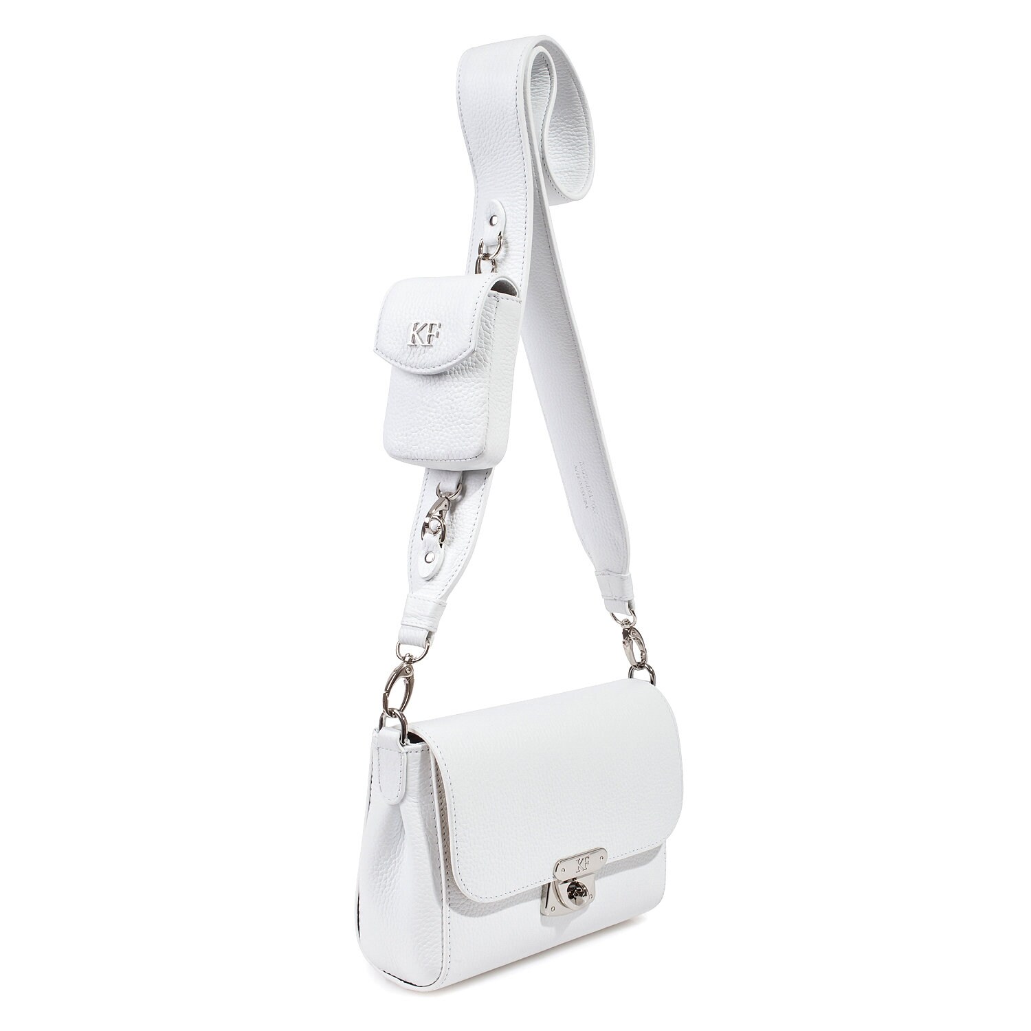 White genuine leather woman shoulder bag from ukrainian designer Katerina Fox. Fashionable and elegant modern bag KF for bright girls and women. This bag is able to attract attention and highlight your exquisite taste. Inside the bag is one large compartment and a convenient zippered pocket for small items, closes the bag on the clasp. The bag is comfortable to wear on the shoulder or across the shoulder.