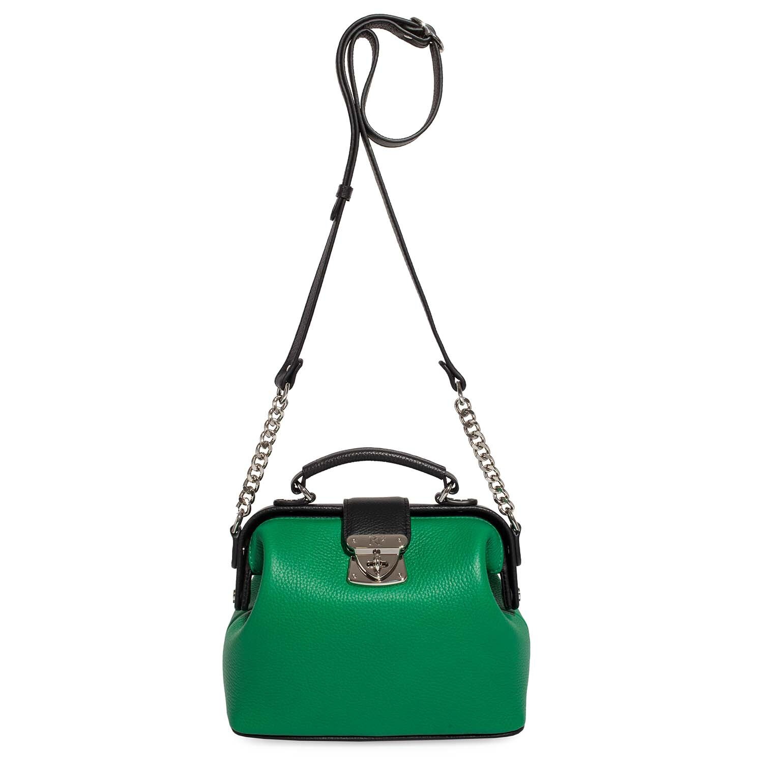 Women's leather doctor bag made of genuine leather, hardware with galvanic coating and microfiber lining. The internal space of a bag is equipped with one spacious compartment, one patch-pocket and one zipper pocket. The bag is closed with a clasp. The kit also includes a storage bag.