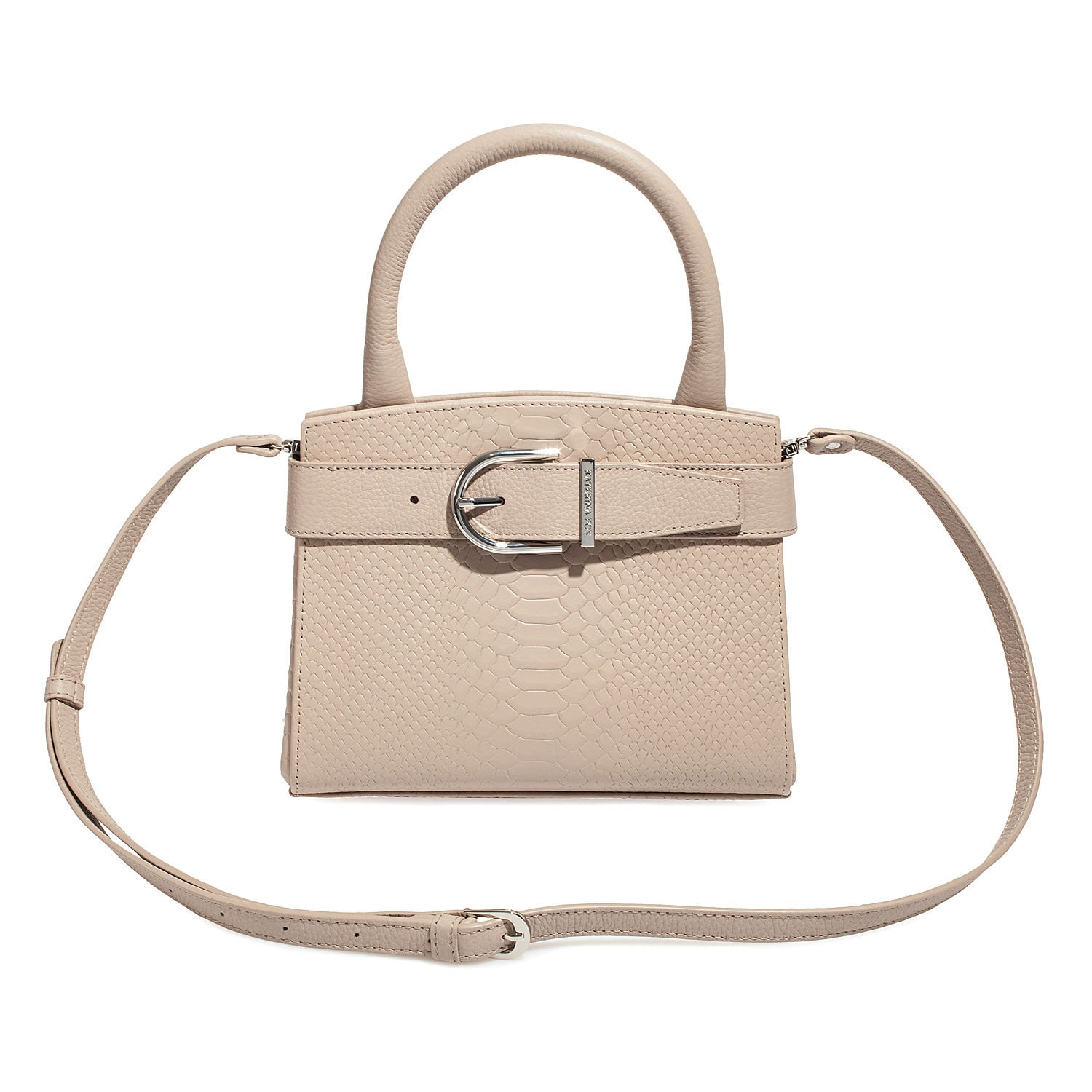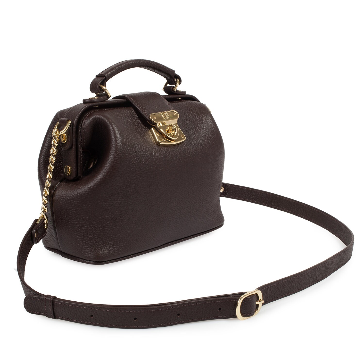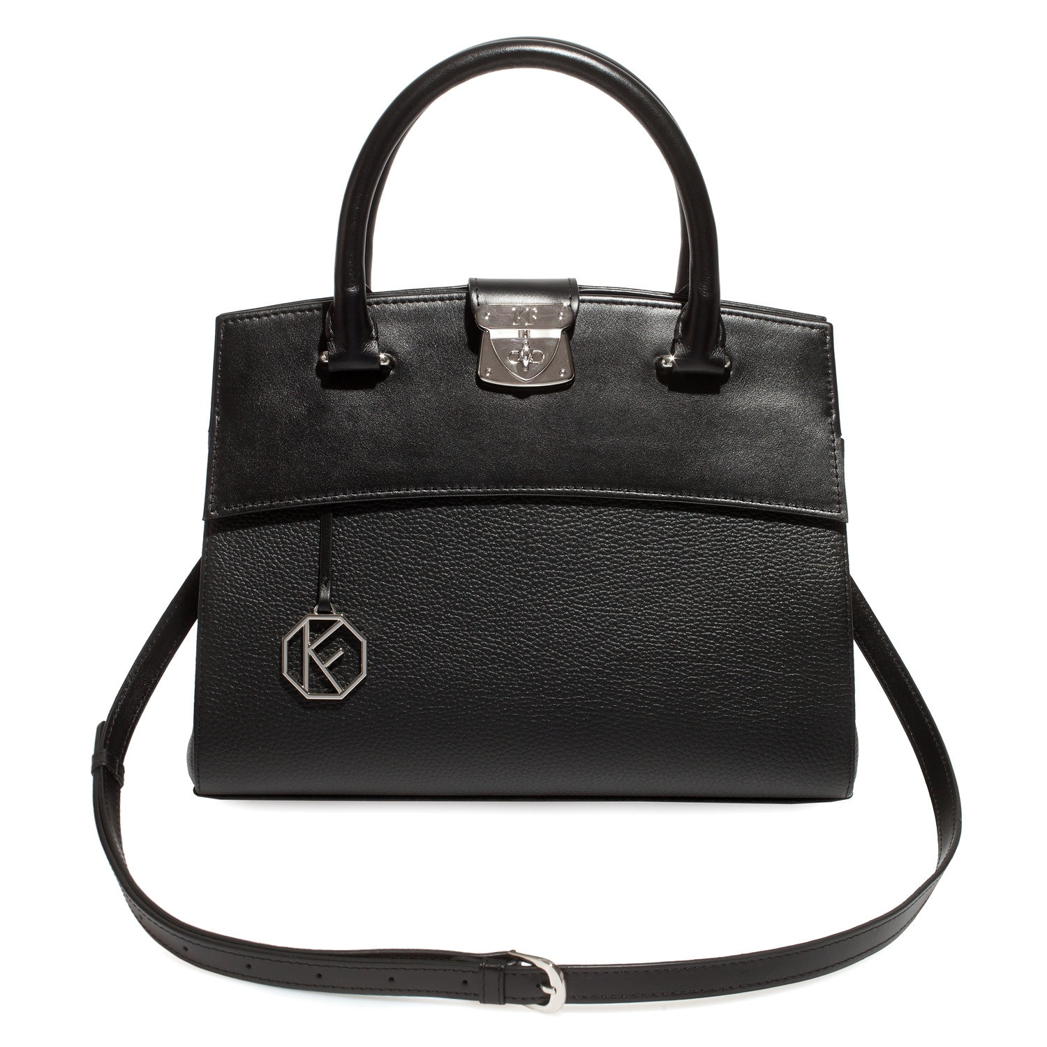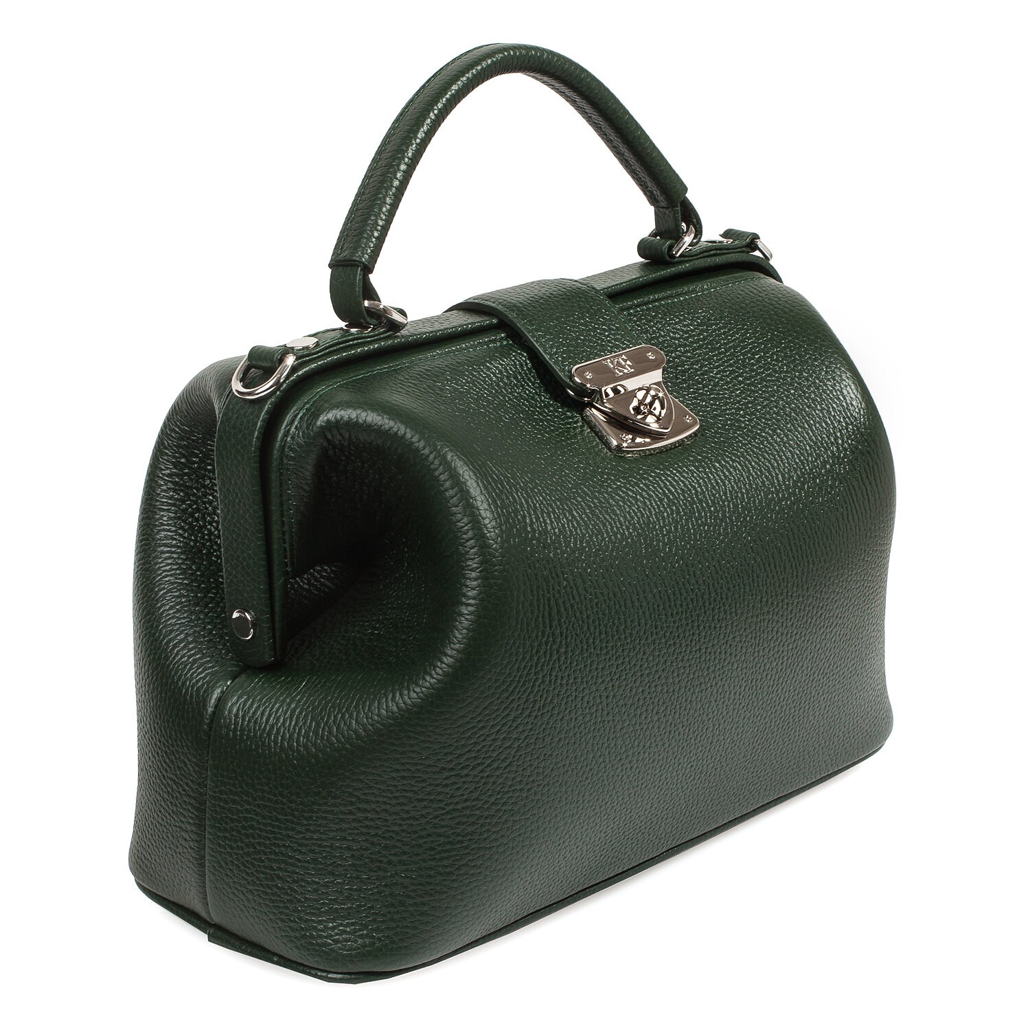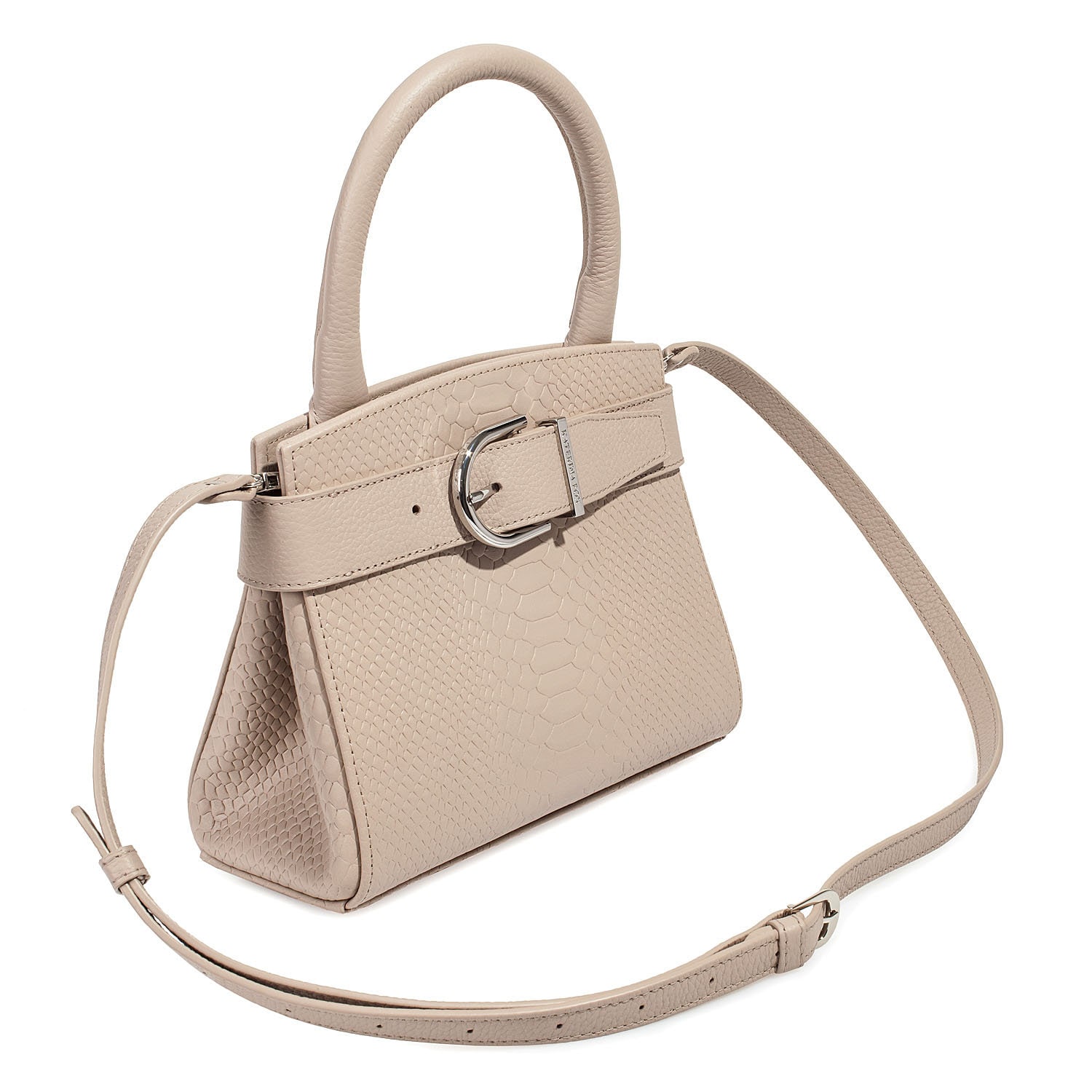 Women's leather bag made of genuine leather, hardware with galvanic coating and microfiber lining. The internal space of a bag is equipped with three spacious compartments and two patch-pockets and one zipper pocket. Closes with 2 buttons magnet. The bottom of the bag is protected with metal legs. The kit also includes a storage bag.